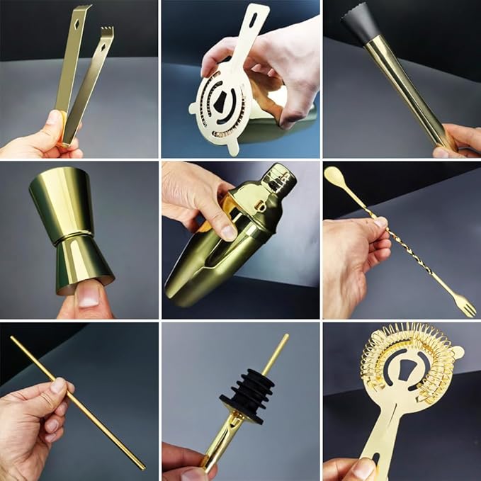 - Bartender Kit included: 1*750ml(25oz) shaker, 1*muddler, 1*15/30ml(0.5/1oz)jigger, 1* ice tongs, 1* ice strainer, 1* fork&spoon, 4 *drinking straw, 4 * Pourer, 1* cocktail Recipes, 1*black stand.