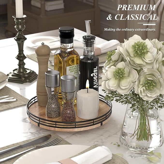 - UPDATED DESIGN: With larger wood base on this lazy Susan for table top, the turntable organizer doesn't wobble, even with heavier items on it. With premium oak wood and classical iron fence make this lazy Susan turntable stylish, functional and adding a touch of rustic charm. it’s also very easy to clean. There are included anti-slip pads on the bottom of the lazy Susan for extra surface protection.