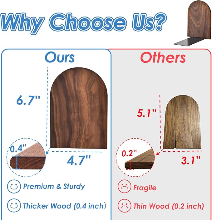 - Natural Black Walnut Craftsmanship: Crafted from black walnut with unique natural grain patterns—no veneers or synthetic dyes, each pair is unique. Thicker wooden bookends are more durable and resistant to drops, adding the breath of nature for your desk.