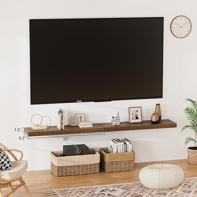 - 【Longer Design】Our pretty 32 inch wall shelves are 32"W x 9.3"D x 1.5"H.Our 32 floating shelves is longer than traditional designs and can hold more items.The walnut floating shelves optimize wall space,helping organize essentials without taking up floor space in your home.