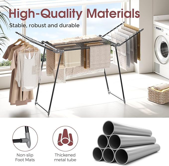 - Premium Built - The foldable dryer rack is made of heavy duty metal and hard plastic to ensure the stability and durability of the drying rack. The coating layer gives the clothes drying rack a rust-free and elegant looks for indoor and outdoor use