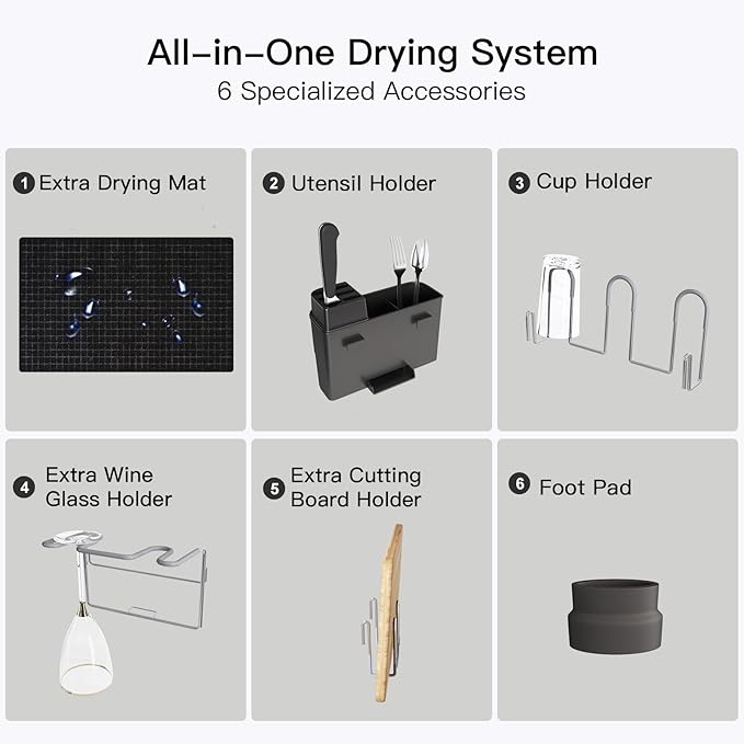 - 🛠️ All-in-One Drying System: 7 specialized accessories: drying mat, utensil holder, drainboard set, wine glass holder, cup holders, cutting board slot, non-slip feet cover. Stores all dish types vertically or horizontally. Maximizes small kitchens