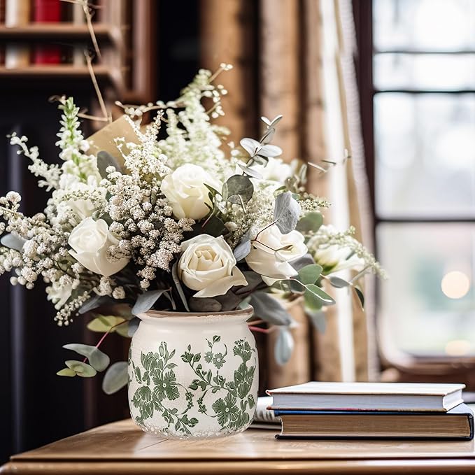 - Vintage Flower Pot: you will get 2 beige and green ceramic planter, which crafted with a distressed scroll pattern and crackle glaze finish, adding a rustic farmhouse vibe to both modern and traditional decor styles; Note: plants not included