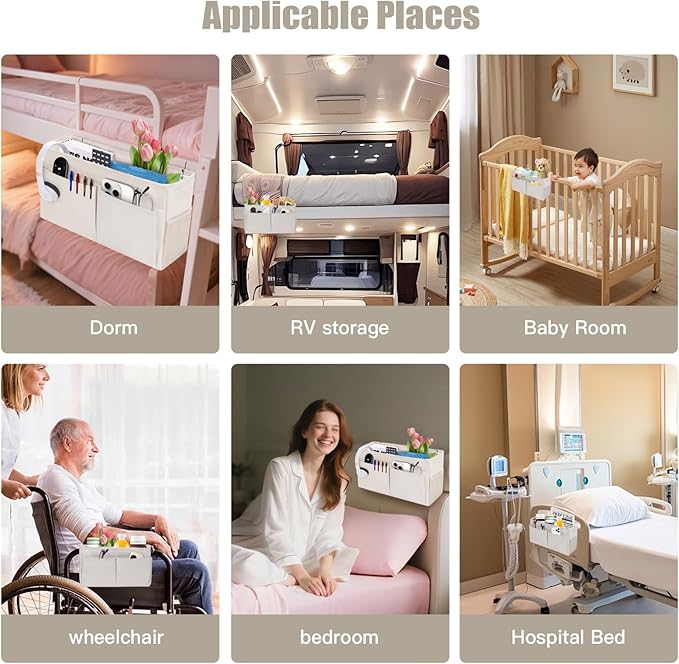 - Multi-Scene Use: This bedside storage caddy is suitable for bedrooms, dormitory bunk beds, hospital beds, crib guardrails, chair armrests, RVs, strollers, camping trips, etc. As long as there is a hanging place, it can be used, which is very convenient.