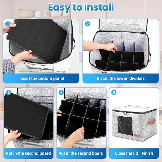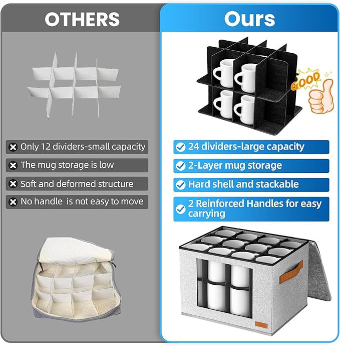 - [Premium Material & Stackable ]This mug storage box with dividers is made of beautiful and upgraded felt, which is more wear-resistant and sturdy. The rigid lid and strong interior make the mug storage organizer stackable, enabling it to save space when storing tableware in the kitchen. while also protecting your mugs, cups, ceramic cups, and glasses from dust.