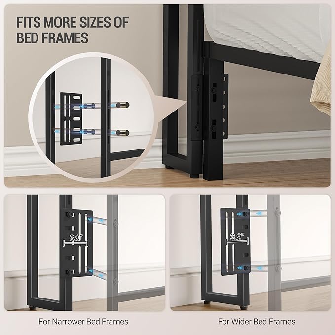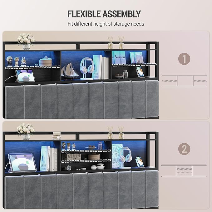 - Large Storage Space & Sturdy Structure: Large Storage Space & Sturdy StructureThe headboard is made of selected particleboard and sturdy metal frame, without shaking or noise. And the top of the headboard is equipped with 3-tier adjustable storage space, which can hold books, phones, clocks or some personal belongings and each has a load-bearing capacity of 66 lbs. The height of the storage space can be adjusted up to 9.5 inches to meet various storage needs
