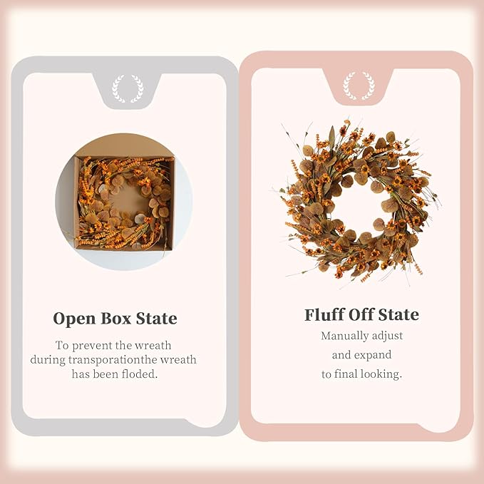 - 【Size Information】 The outer diameter of this front door autumn wreath is approximately 20 inches. Due to transportation reasons, the wreath is shrink-packed into a smaller box. Upon receipt, please stretch the leaves and adjust the shape of the wreath to restore its full and rounded appearance