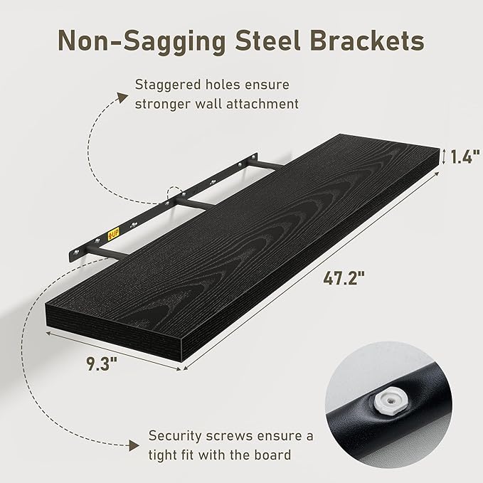 Black Floating Shelves Wall Shelf 48 Inch, 9.3 Inch Deep Floating Shelf for Wall, Farmhouse Black Wood Shelves Invisible Bracket for Living Room, Bedroom, Kitchen, 48 x 9.3 x 1.4 Inch, Set of 2