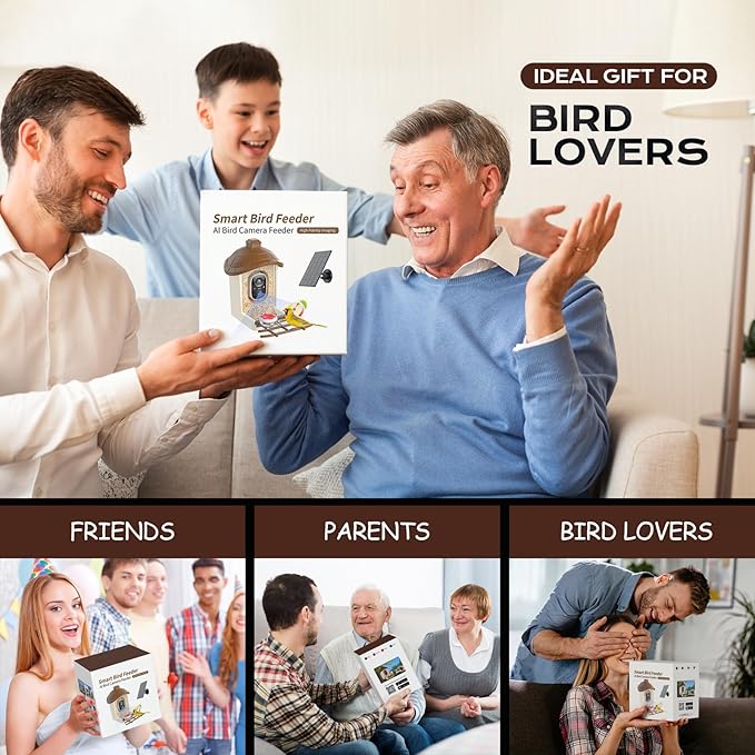 - 【Ideal Gift for Family and Friends】This bird feeder is an ideal gift for bird lovers on special occasions such as birthdays, anniversaries, Valentine's Day, Mother's Day, Father's Day, Thanksgiving and Christmas. The smart bird feeder also supports multiple people to share the camera, watch videos online at the same time, and enjoy bird watching time with friends and family.