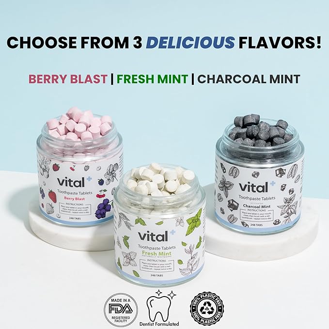 Vital Toothpaste Tabs with Nano-Hydroxyapatite | Naturally Whitens + Remineralizes Teeth | Fluoride & Plastic Free | Combats Sensitivity | Travel & Eco Friendly | Charcoal Mint | 248 Tablets (4 Month)