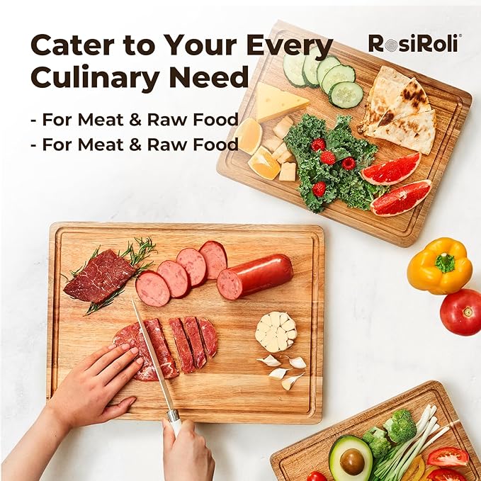 - Stylish & Durable Wood Cutting Boards - Experience elegance meets function. Built-in Deep Juice Groove - One side features the juice groove that catches juices for use in gravies and sauces.With Featuring detachable non-slip feet, they stay securely in place during use while offering versatile dual-sided functionality—flip to extend board life or separate tasks effortlessly, also as charcuterie boards.