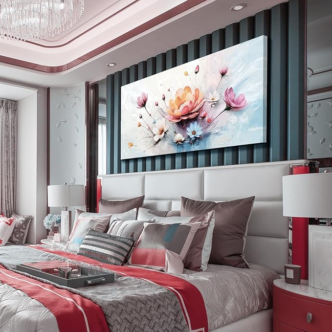 amatop Large Floral Wall Art – Modern Pink White and Blue Abstract Colorful Flower Bouquet Print Large Botanical Canvas Picture Nature Artwork Wall Decor for Living Room Bedroom Office 48x24 inch