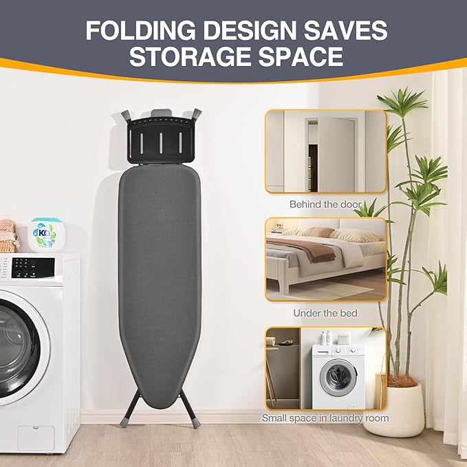 - Space-Saving Foldable Design-When not in use, simply fold it flat! This foldable ironing board is designed for compact storage—tuck it neatly in a closet, behind a door, or under a bed without taking up valuable space.