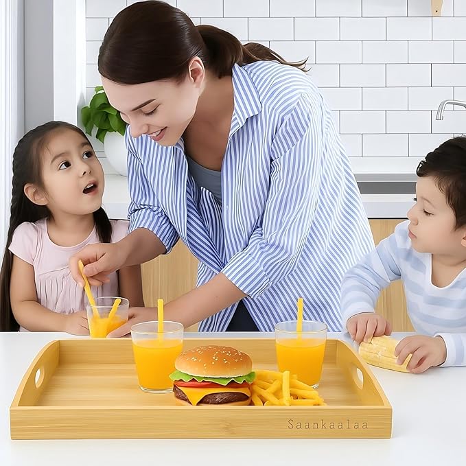 - Stylish & Versatile Design: This high quality bamboo tray set is well crafted, simple but with modern looking, light but sturdy. The gently curved tops of the end pieces add a touch of elegance. Large size 17" x 13" x 1.5", fantastic as wooden trays for serving food, tray for coffee table, or decorative pieces—every detail is crafted for your comfort and joy.
