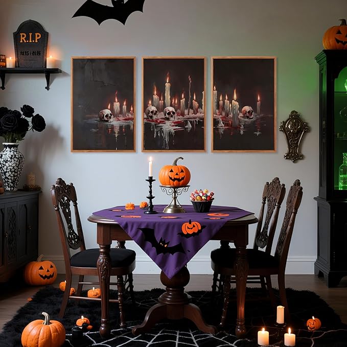 - Gothic Bloody Skull and Candles-- The details of Aurlan halloween wall art set of 3 are exquisitely processed, such as the melted wax on the candles, the reflections and bloodstains in the liquid. The overall image gives people a sense of horror, mystery, and religious rituals.
