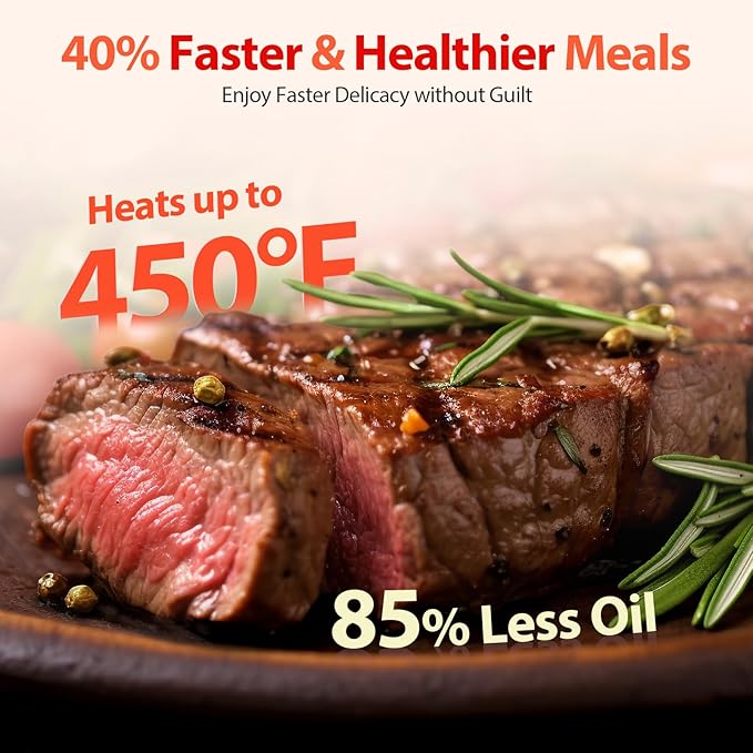 - 【Healthier Meal in Minutes】With industry-leading temperatures up to 450°F and unique metal chamber design, this air fryer heats 40% faster than traditional oven, and up to 85%-90% less oil healthy results every time!