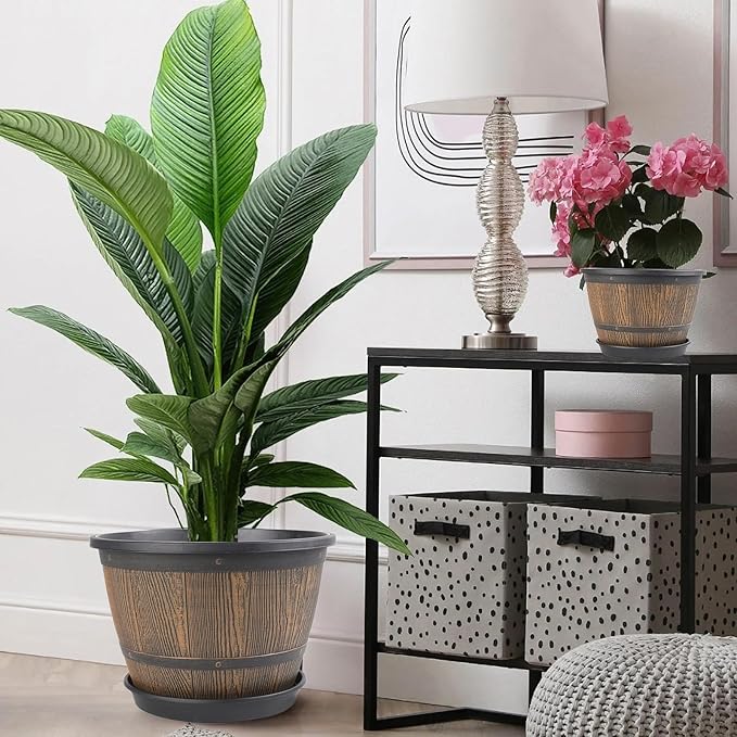 - 【Decorative Planters】Plastic large pots for plants are perfect for indoor outdoor---decorating your living room, kitchen, bedroom, balcony, garden, porch, patio and so on. These whiskey barrel planters outdoor are a must-have for plant lovers. Give your plants a stylish home while bringing your green dreams to life!