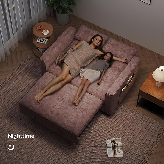3 in 1 Convertible Sleeper Sofa Bed, Pull Out Couch Bed with Adjustable Backrest, Chenille Loveseat Couches with Side Pocket for Living Room, Bedroom (Pink)