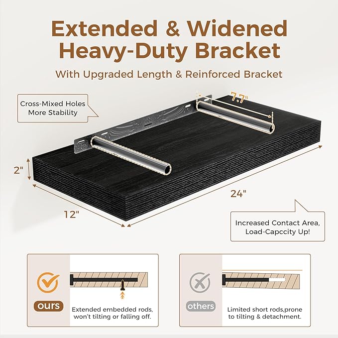 - 【12 INCH DEEP FLOATING SHELF】This extra deeper and thicker wall shelves are 12 inches in depth and 2 inches in thickness instead of the regular narrow floating shelves, you can put photos, pictures, DVD players, videos, books, toys, and some other knickknack on this beautiful display wooden shelf.