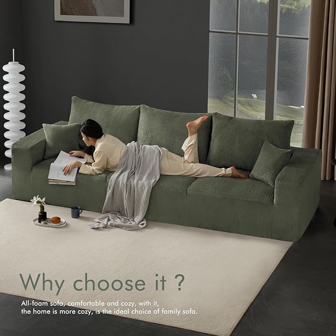 Boneless Cloud Couch Sofa for Living Room, 112" 3 Seater Green Modern Lounge Sleeper Couch, No Assemble, Cordury Compression Upholstered Couches
