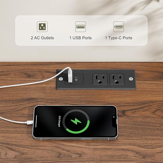 - Integrated Charging Station: The TV cabinet is equipped with power outlets and cable ports for convenient charging and device connectivity. No need to purchase additional power cords