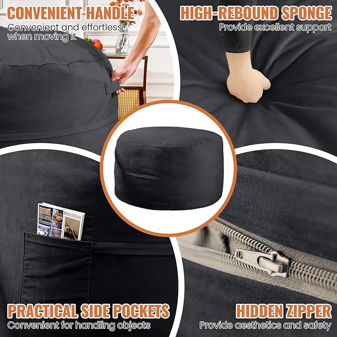 - CONVENIENT & PRACTICAL DESIGN: The bean bag features a side pocket for easy storage of small items like phones and books, as well as a handle for easy moving. Enjoy comfortable relaxation wherever you like.