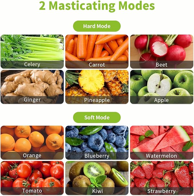 - Soft & Hard Masticating Modes: This celery juicer has 2 masticating modes that are suitable for different fruits and vegetables. You can use the 'Hard' mode for celery, carrot, apple and the 'Soft' mode for orange, blueberry, watermelon